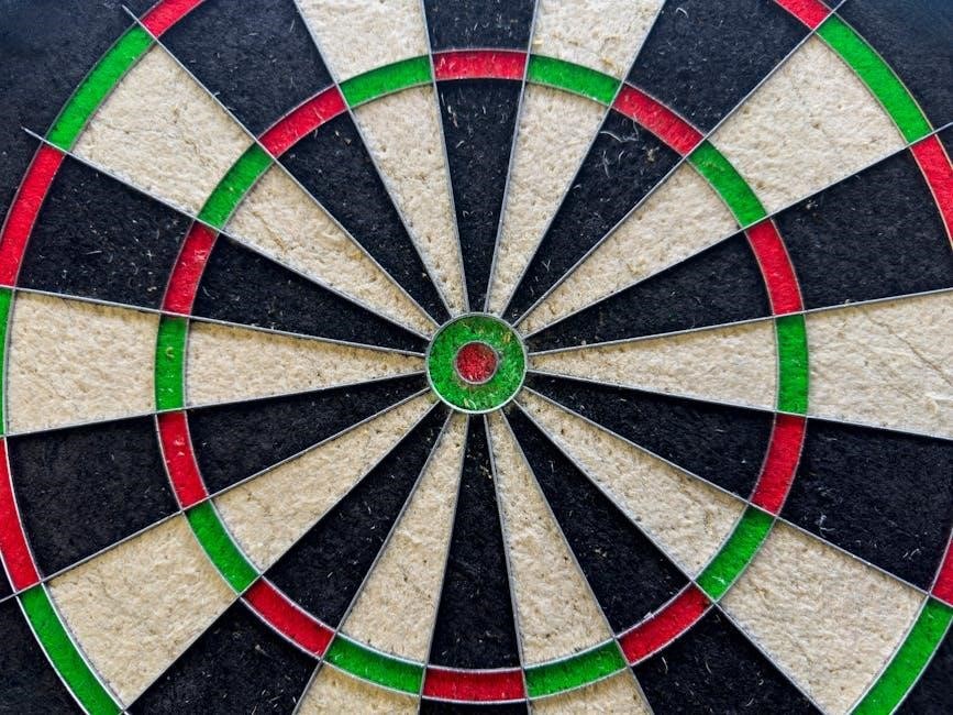 The Arachnid dart board manual provides a comprehensive guide to setup, gameplay, and maintenance. It covers unpacking, assembly, and safety precautions to ensure a secure playing environment. The manual highlights the board’s advanced features, such as multiple game options, scoring systems, and customizable settings. Regular cleaning and software updates are emphasized for optimal performance. Troubleshooting tips and accessories are also included to enhance your experience. By following the manual, users can maximize their enjoyment and extend the dart board’s longevity. This guide is essential for both new and experienced players to make the most of their Arachnid dart board.